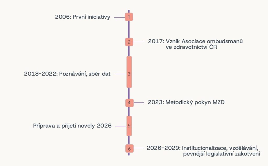 Když se ohlédneme zpět, tak je vidět, že toto máme za sebou docela hodně. Od prvních ombudsmanů působících ještě před rokem 2010, přes vznik Asociace až po vydání Metodického pokynu a základní zákonné úpravy. Na přípravě metodického pokynu, který jsem popsala např. tady, i zákonné úpravy, jsem se přímo podílela v rámci své agendy na Ministerstvu zdravotnictví.