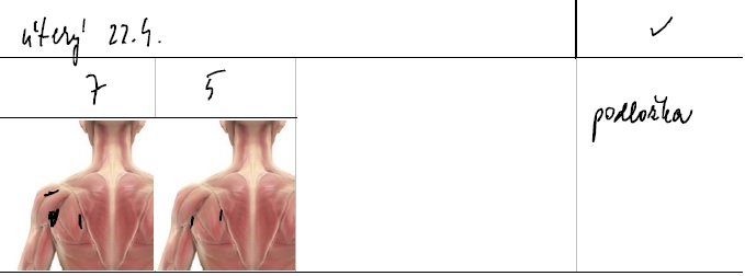 Ze zápisů se ukázalo, že největší bolest přicházela po nošení těžkého batohu a odeznívala dost dlouho. Fyzioterapeut se na základě toho zaměřil na „skalenové svaly“ na krku a díky tomu jsem po třech letech pravděpodobně nalezla příčinu mých obtíží.
