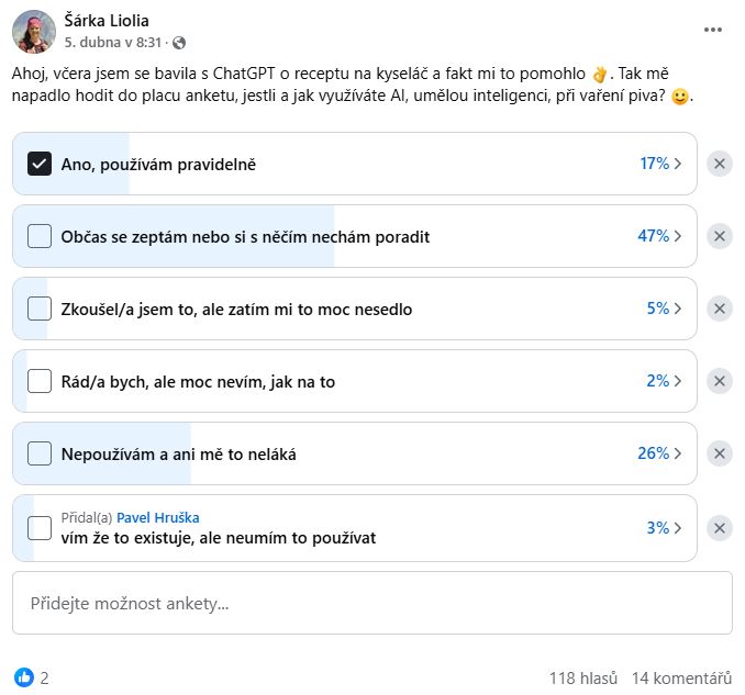 Z výsledků vyplynulo, že většina hlasujících (64 %) už má s AI alespoň nějakou zkušenost – buď ji aktivně využívají, nebo se k ní příležitostně obrací pro radu. To ukazuje, že umělá inteligence si pomalu nachází místo i mezi domácím pivovarnictvem.