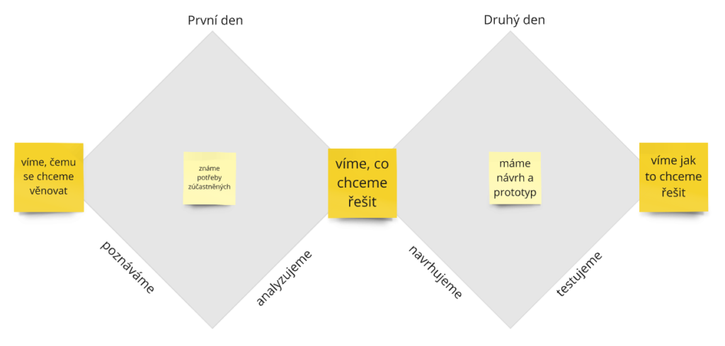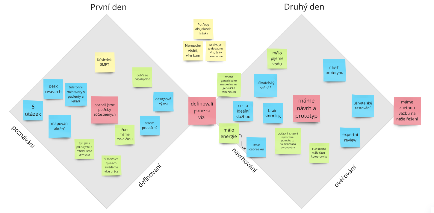 V designovém procesu jsme následovali dvojitý diamant – přístup, ve kterém poznáváme, analyzujeme, prototypujeme a ověřujeme. Proces, na jehož začátku je výzva, po poznání a analýze definujeme, co chceme řešit a po navrhování a testování víme, jak to řešit. Pro každou fázi designového procesu jsou vhodné jiné metody, z nichž spousta je popsaných na https://kisk.phil.muni.cz/100metod.