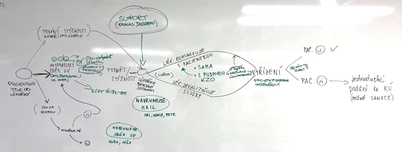 Po zabydlení se v učebně, poskládání stolů tak, aby to vyhovovalo lépe našim potřebám, po icebreakeru, po domluvě rozhodovacích principů, určení rolí v týmu jsme se vrhli na první metody. Začali jsme 6 otázkami, které jsme vyplnili každý za sebe a následně si odpovědi sesouladili a napsali na tabuli, takže jsme je měli celý hackaton na očích. Následovalo zúžení tématu na proces, kdy pacientstvo je nespokojené v souvislosti se zdravotní péčí poskytovanou v ambulancích (tj. ne v nemocnicích). Pro získání základních dat jsme se rozdělili do skupinek, kdy jedna dělala rychlý desk research a druhá mapování aktérů. K tomu jsme přidali můj vhled a seznámení se statusem quo – jaké má nyní pacientstvo možnosti ve chvíli, kde není spokojené se zdravotními službami a chce to řešit.
