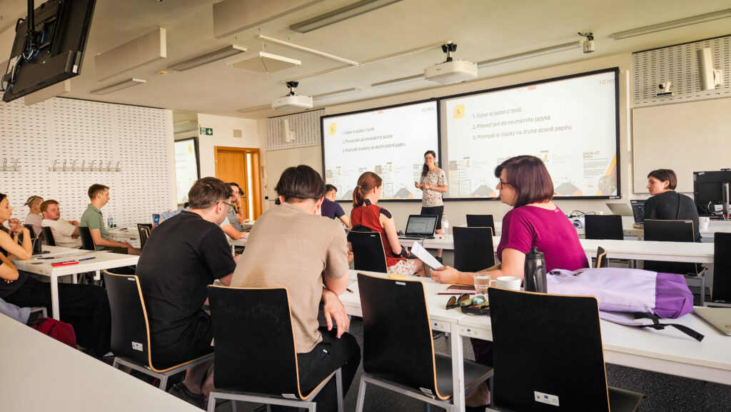Poté jsme si ukázali, jaké jsou možnosti používání genderově senzitivního jazyka a takovým malým vyvrcholením workshopu bylo přímo vyzkoušení si práce s jazykem. Účastnictvo individuálně pracovalo s pracovními texty v generickém maskulinu – kapitolou ebooku, shrnutím výzkumné zprávy nebo reklamním letáčkem – a převáděli je do neutrálního jazyka. Někdy šli směrem rodové specializace („horolezci a horolezkyně“), jinde volili neutralizaci („odbornictvo“) nebo pracovali s tzv. neosobní formulací („bylo rozhodnuto“). Diskuze nad tím, kdy už jazyk začíná být „krkolomný“ a kdy jen nezvyklý, byla jednou z nejzajímavějších.